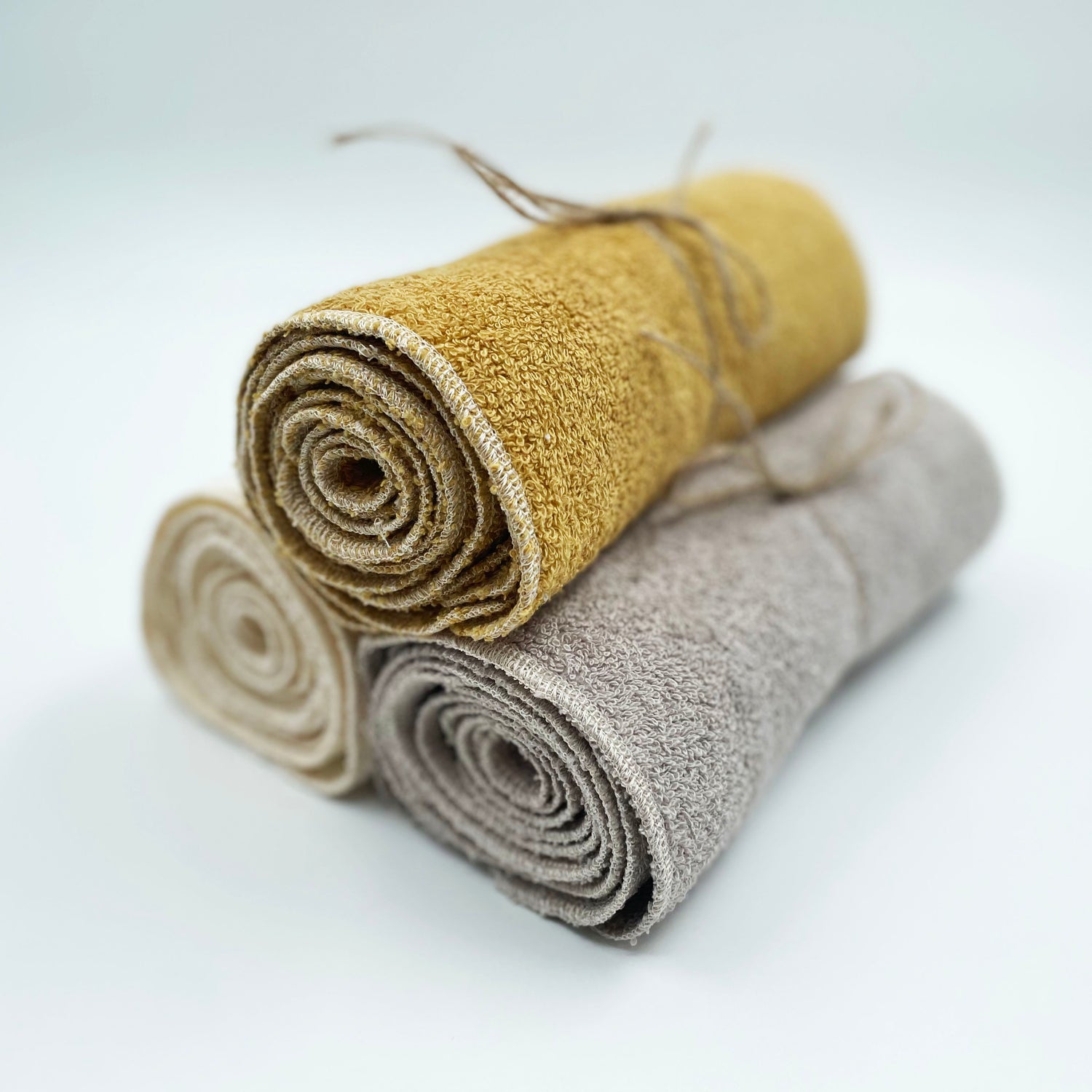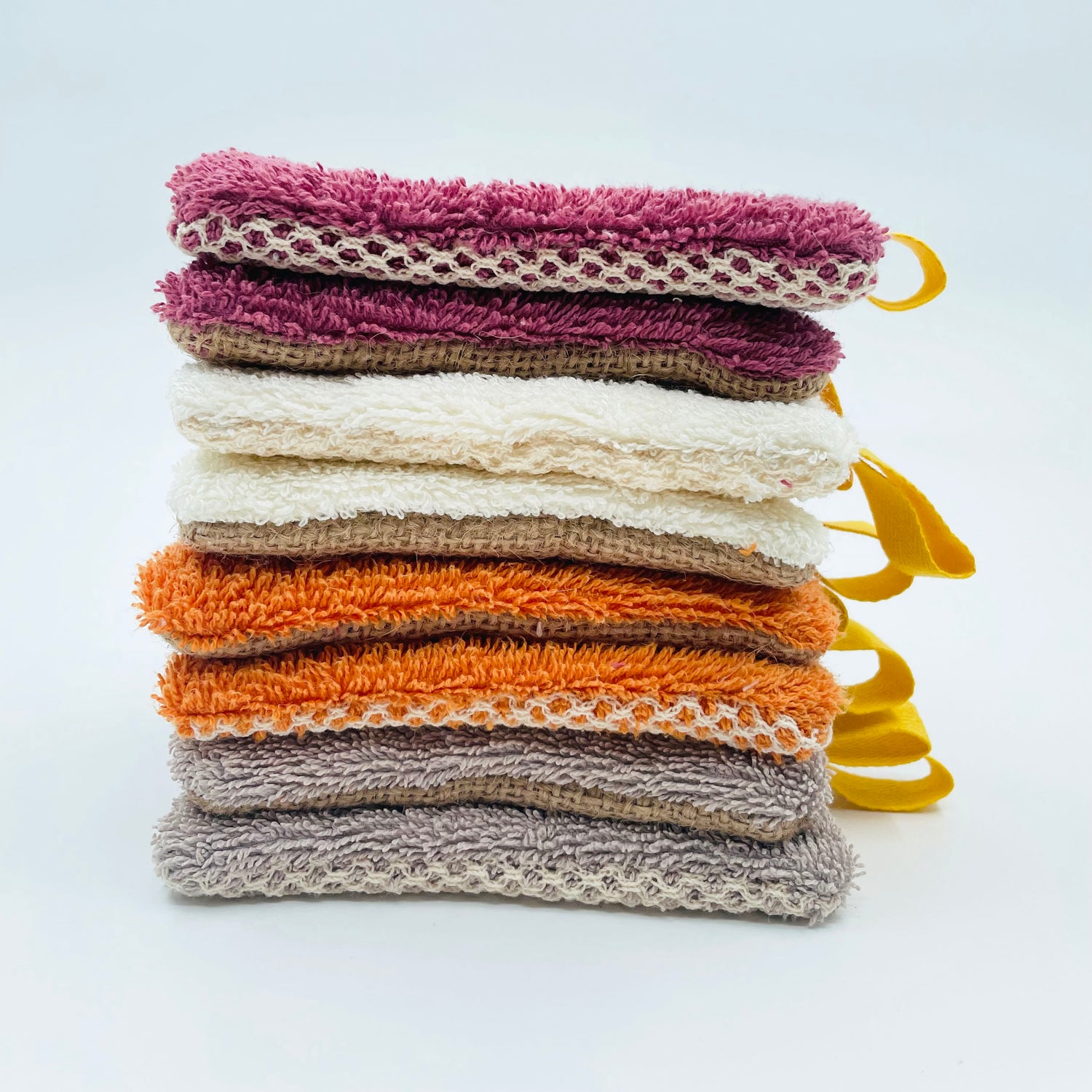 Material: Återvunnet frotté, bomullnät av GOTS-certifierad bomull, juteväv(eko)