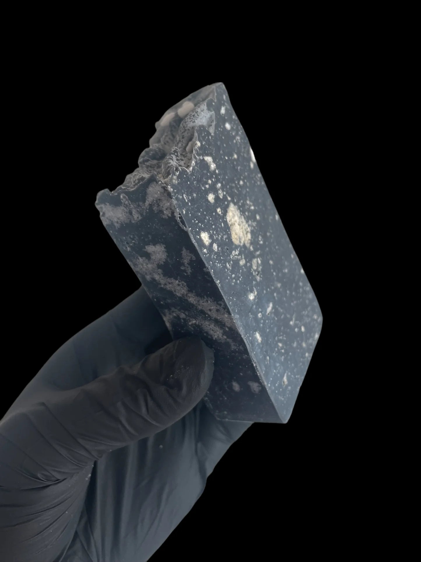 Den nattsvarta färgen kommer från aktivt kol, känt för sina djuprengörande egenskaper, som lämnar huden extra fräsch. Kaolinlera är inblandad både som mjuka inslag i tvålen och som små klumpar som påminner om stjärnbilder. Doften är mystiskt frisk med eteriska oljor av rosmarin och tea tree.