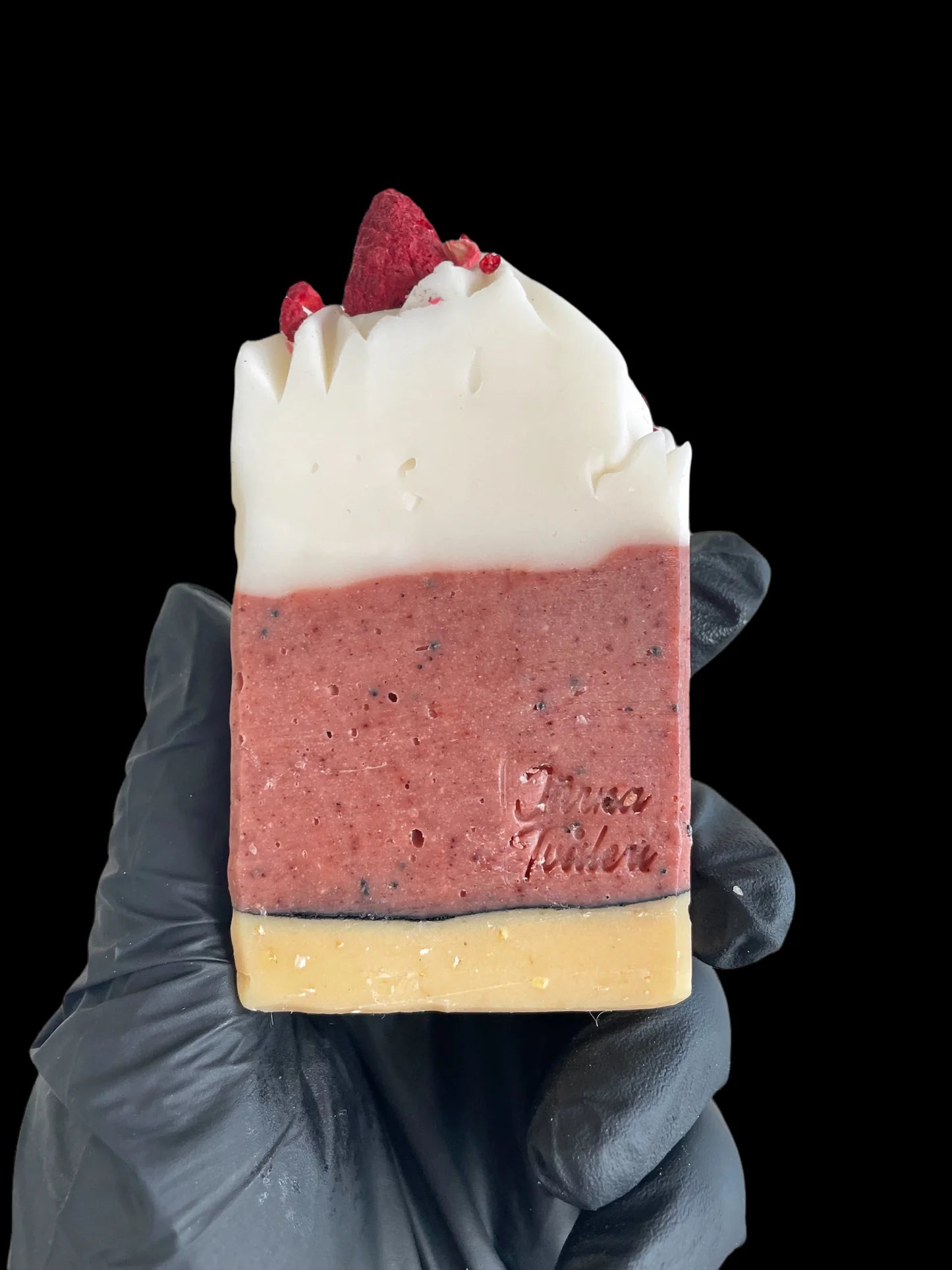 Doftupplevelsen är mild och härlig, tack vare eteriska oljor av litsea cubeba och lavendel. Naturliga färger kommer från rosa lera, krapprotspulver, aktivt kol och kollodialt havre. Tvålen är dekorerad med spritsad färglös tvål och frystorkade ekologiska hallon.